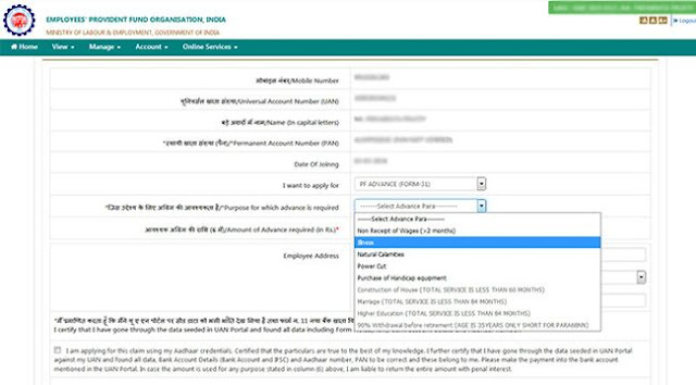5) You need to fill the purpose for which the advance is required. Click on the drop-down menu where you will be shown all available advance options that you are eligible for. You have to select the kind of advance (i.e non-receipt of wage, illness, natural calamities, power cut, purchase of handicap equipment) that you want to apply for. In the next field, fill the amount you want as advance and give your current address.